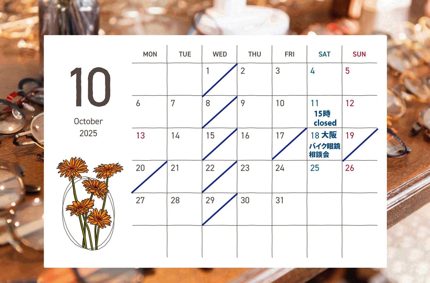 10/18(土) | 臨時休業 | — | 大阪にてバイクメガネ相談会 |