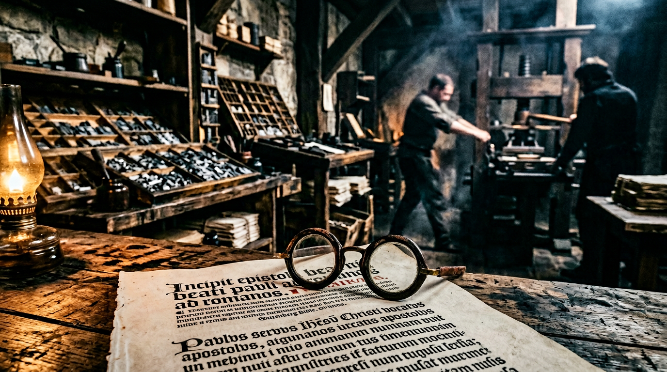 15世紀、グーテンベルクによる「活版印刷」の発明。これは情報の革命であると同時に、メガネの歴史における「最大のターニングポイント」でもありました。なぜなら、本が大量生産されたことで、全人類が初めて自分の「老眼」に気づいたからです。