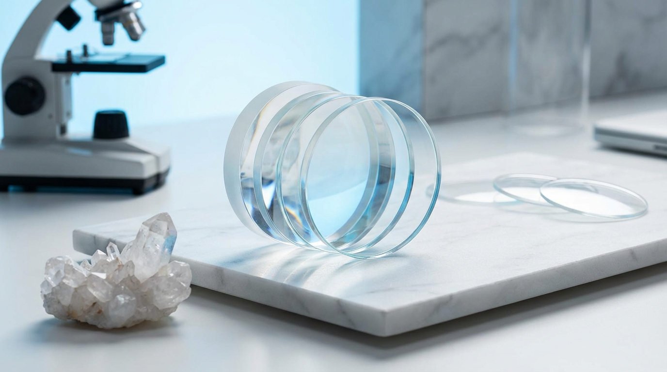 - 天然石とガラスの時代: 19世紀までは「天然石(水晶)」や、屈折率を高めた「鉛ガラス」が主流でした。見え方は非常にクリアですが、致命的に重く、衝撃に弱いという弱点がありました。